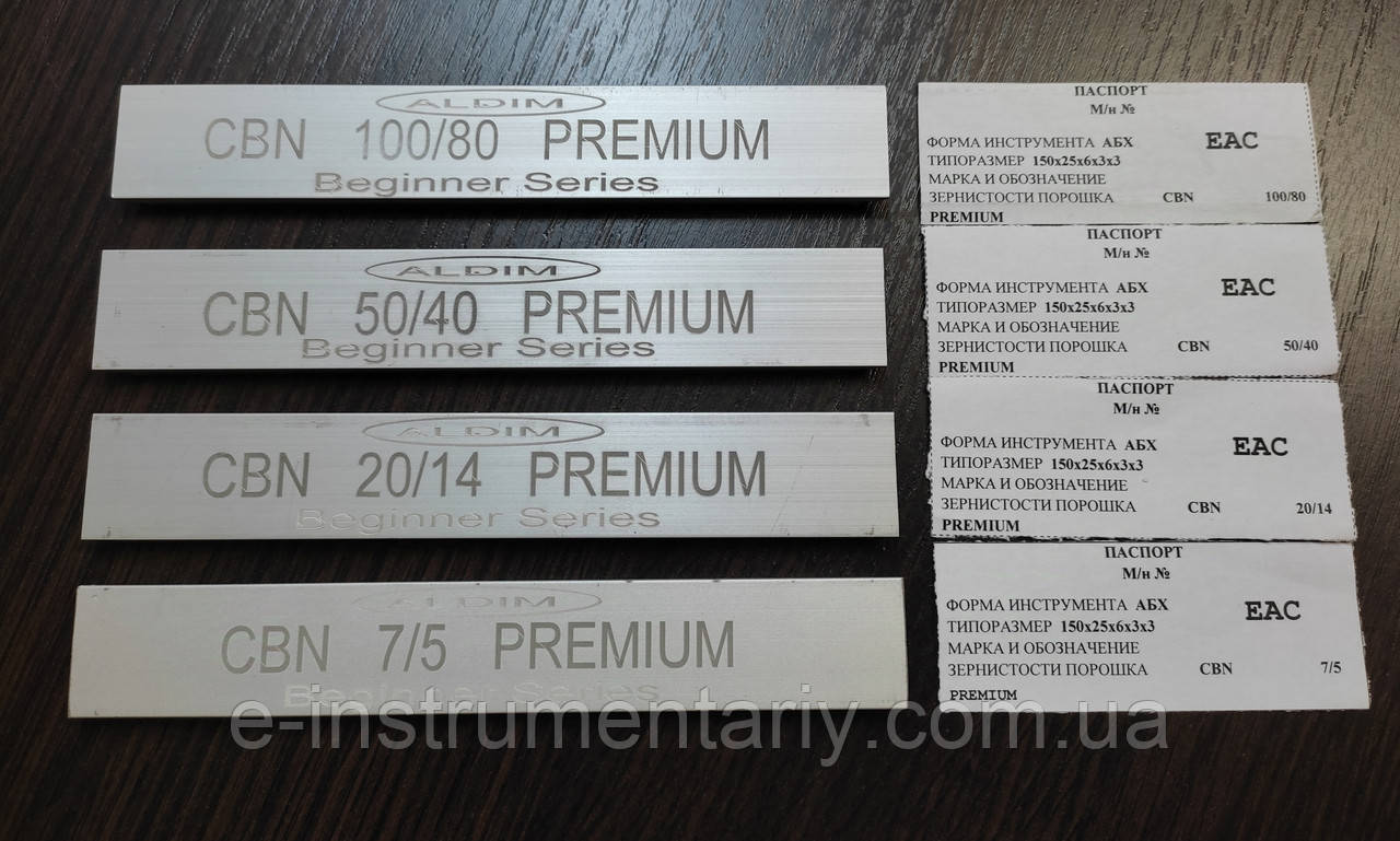 Для різних етапів заточування є в наявності ельборові бруски різної зернистості: грубіші для формування РК і чорного заточування лез, дрібніші зерна – для чистового заточування, Доводки та полірування.